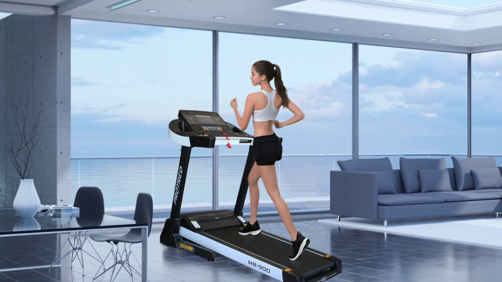 Διάδρομος Γυμναστικής ProTred® MR-900 με ισχυρό κινητήρα 3.0HP, άνετο τάπητα 48×130 εκατοστών, πρωτοποριακό σύστημα λίπανσης, εξαιρετικό αντικραδασμικό σύστημα με αμορτισέρ και ηλεκτρονικά ρυθμιζόμενη κλίση 15 επιπέδων.