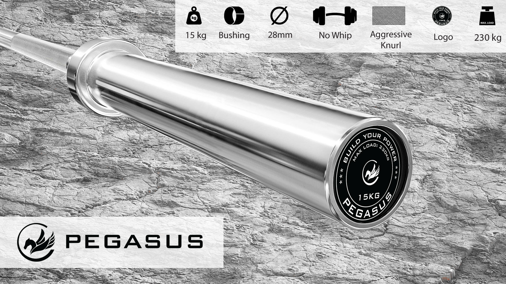 Η Ολυμπιακή Μπάρα Pegasus® είναι κατάλληλη για προπόνηση σε πάγκο, κλωβό και για σωματικό βάρος. Χρησιμοποιείται σε προπονήσεις που έχουν ως αποτέλεσμα την ενδυνάμωση των μυών. Διαθέτει μήκος 200cm, ορειχάλκινους δακτυλίους, λαβή 28mm και το μέγιστο βάρος φορτίου 450kg. Η Ολυμπιακή μπάρα είναι πλήρως χρωμιωμένη και διαθέτει εγχάρακτη λαβή που λειτουργεί αντιολισθητικά για να κάνει τη λαβή πιο σφιχτή και ασφαλής.