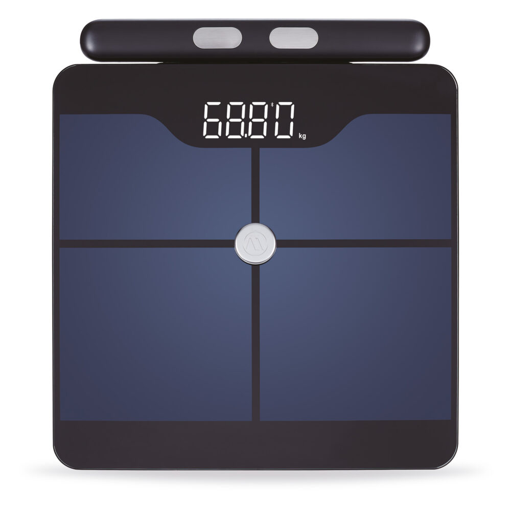 Ζυγαριά σύνθεσης σώματος, με λαβή που περιλαμβάνει μεταλλικούς αισθητήρες, γυάλινη επιφάνεια με επίστρωση ITO και ασύρματη σύνδεση.